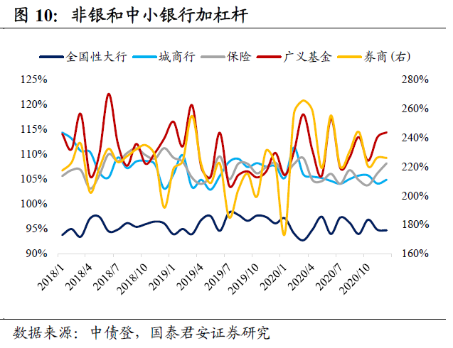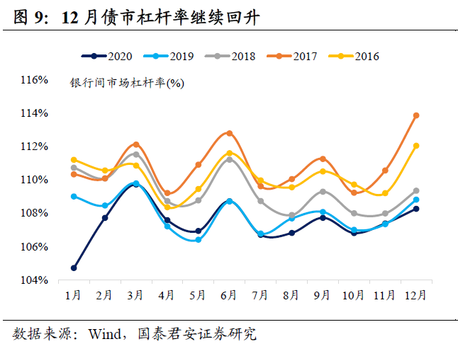 12月债市杠杆率继续回升,非银和中小银行加杠杆。以“中债登托管量/(中债登托管量-待购回债券净余额)”衡量的12月债市杠杆率为108.3%,环比上升0.9个百分点,同比下降0.5个百分点。全国性大行为94.7%,环比下降0.1个百分点;城商行和农商行分别为104.8%和101.5%,环比上升0.7和0.6个百分点;保险和广义基金杠杆率分别为108.2%和114.4%,环比上升2.0和1.0个百分点;券商杠杆率为226.0%,环比下降0.2个百分点。