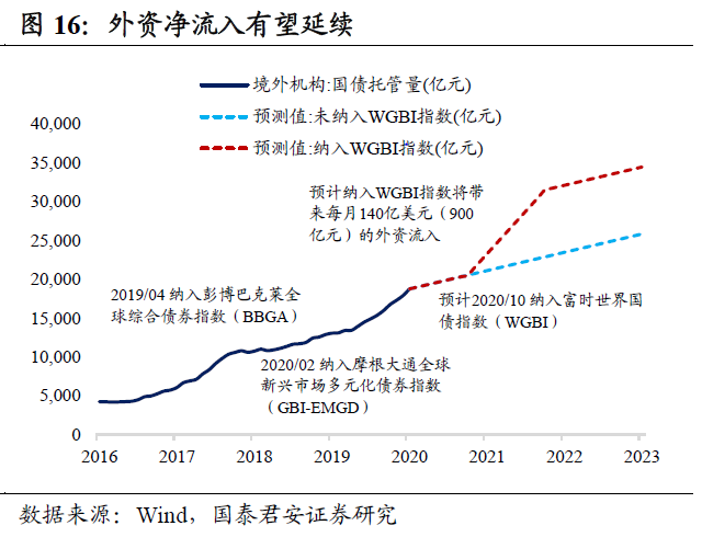 高利差+强汇率+纳入全球三大指数,外资净流入有望延续。2020年境外机构净增持中国债券1.07万亿,目前持有的国债占国债总托管量比重为9.2%,政金债占比为4.9%。人民币债券在全球资产配置占比仍然低于1%,预计纳入WGBI指数将吸引约1680亿美元的外资流入,从10月开始分12个月完成,每月140亿美元。