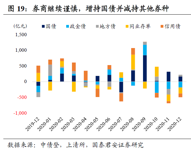 券商继续谨慎,增持国债并减持其他券种。券商总托管量减少482亿,连续三个月净减持,较11月环比多减56亿。信用余波和年末效应下,券商交易热情不高。券商增持利率债28亿(环比增加130亿),其中增持国债161亿和地方债54亿,减持政金债187亿。此外,减持存单192亿,同时连续三个月减持信用债,减持119亿,其中减持超短融49亿、短融33亿和中票42亿。