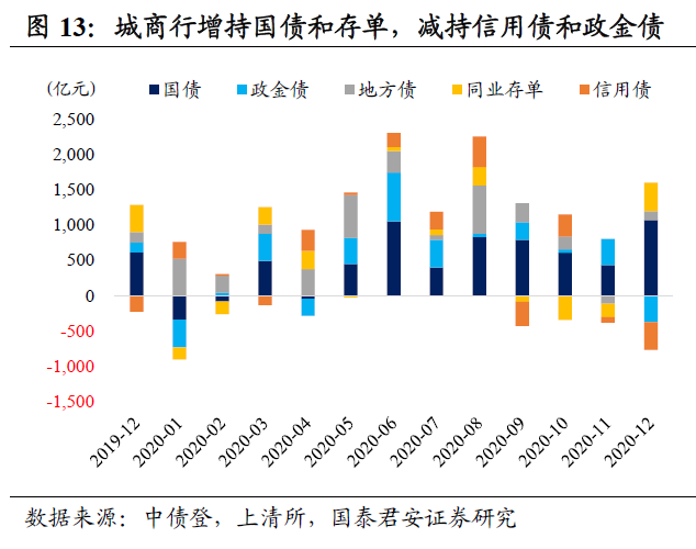 年底指标考核压力下,银行整体配置力量不强。商业银行增持国债,全面减持其他券种。12月商业银行增持利率债1387亿(环比减少1533亿),其中增持国债3388亿,减持政金债1140亿和地方债861亿,同时连续三个月减持存单,减持存单3134亿(环比减少2279亿)。面临资本充足率和流动性指标等考核,叠加市场信心仍在修复,银行增持信用债意愿不足,减持信用债1448亿(环比减少716亿),其中减持超短融1309亿和中票111亿。