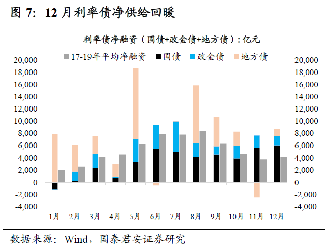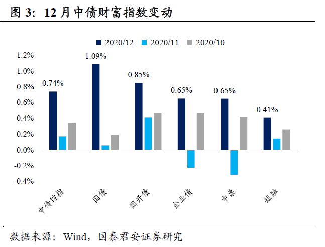 根据中债指数,12月国债和国开债的持有回报率分别为1.09%和0.85%,利率债表现亮眼,较11月0.06%和0.41%显著改善,信用债综合表现也有所回暖,高评级强于中低评级,11月企业债、中票、短融的持有回报率分别为0.65%、0.65%、0.41%,均强于11月-0.23%、-0.32%、0.14%。