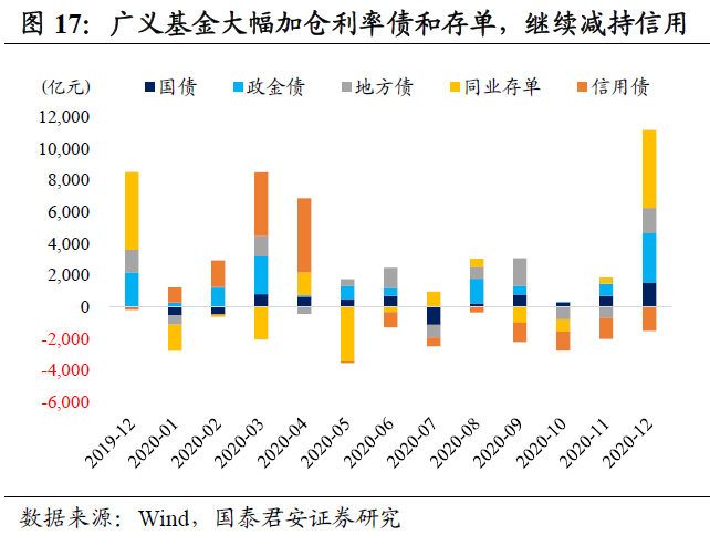 广义基金大幅加仓利率债和存单,继续减持信用债。广义基金总托管量增加9814亿,仅次于2020年1月单月净增持1.63万亿,较11月环比增加8325亿。作为12月最大增持机构,主要增持利率债6259亿(环比增加5471亿),其中增持政金债3115亿、地方债1595亿和国债1549亿。另外,增持存单4921亿(环比增加4545亿),同时连续第八个月减持信用债,减持1509亿(环比多减180亿)并再创减持记录,其中减持超短融1306亿、短融143亿和企业债174亿,增持中票115亿。