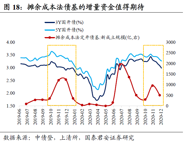 下一阶段,较为确定的增量资金是摊余成本法债基,潜在规模在5000-7000亿,由于部分公募专户产品缺乏数据,实际配置力量可能更多,利好3-5年政金债品种,有望进一步强化债市反弹行情。