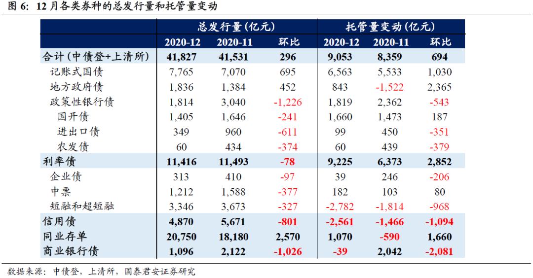 保险需求平稳,保费开门红有望加强配债。保险总托管量增加375亿,较11月环比少增484亿。主要增持利率债233亿(环比减少252亿),其中增持国债325亿、减持地方债90亿,年内首次减持地方债,同时增持存单11亿。另外减持信用债19亿,其中减持中票23亿和增持企业债5亿。随着2021年利率债供给压力缓和一季度保费开门红,保险的配置需求有望进一步得到释放。