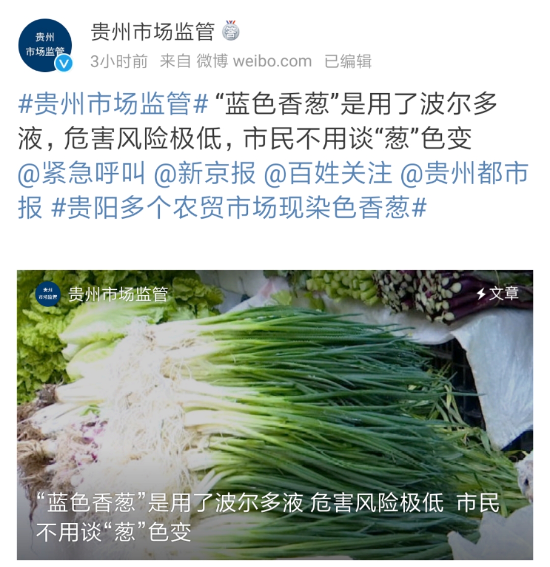 1月12日,贵阳市市场监管局相关负责人张妮告诉新京报记者,贵阳市市场监管部门对“蓝色香葱”进行了排查,并责令立即暂停销售。经检测,蓝色物质是波尔多液残留物,是一种保护性杀菌剂,危害风险极低。