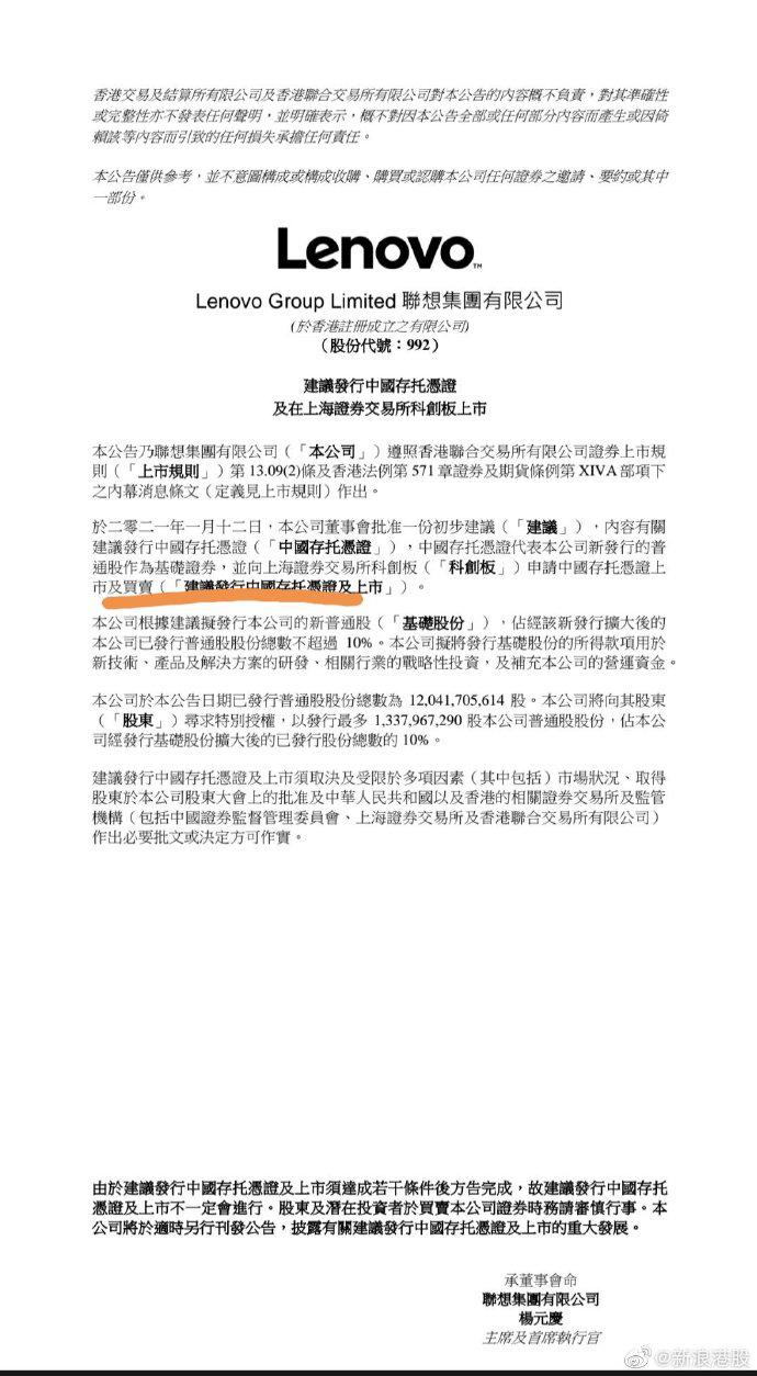 1月12日,联想集团对外发布消息称,计划在上海证券交易所科创板上市。联想集团宣布董事会已批准可能发行中国存托凭证(CDR)、并向上海证券交易所科创板申请CDR上市及买卖的初步建议。