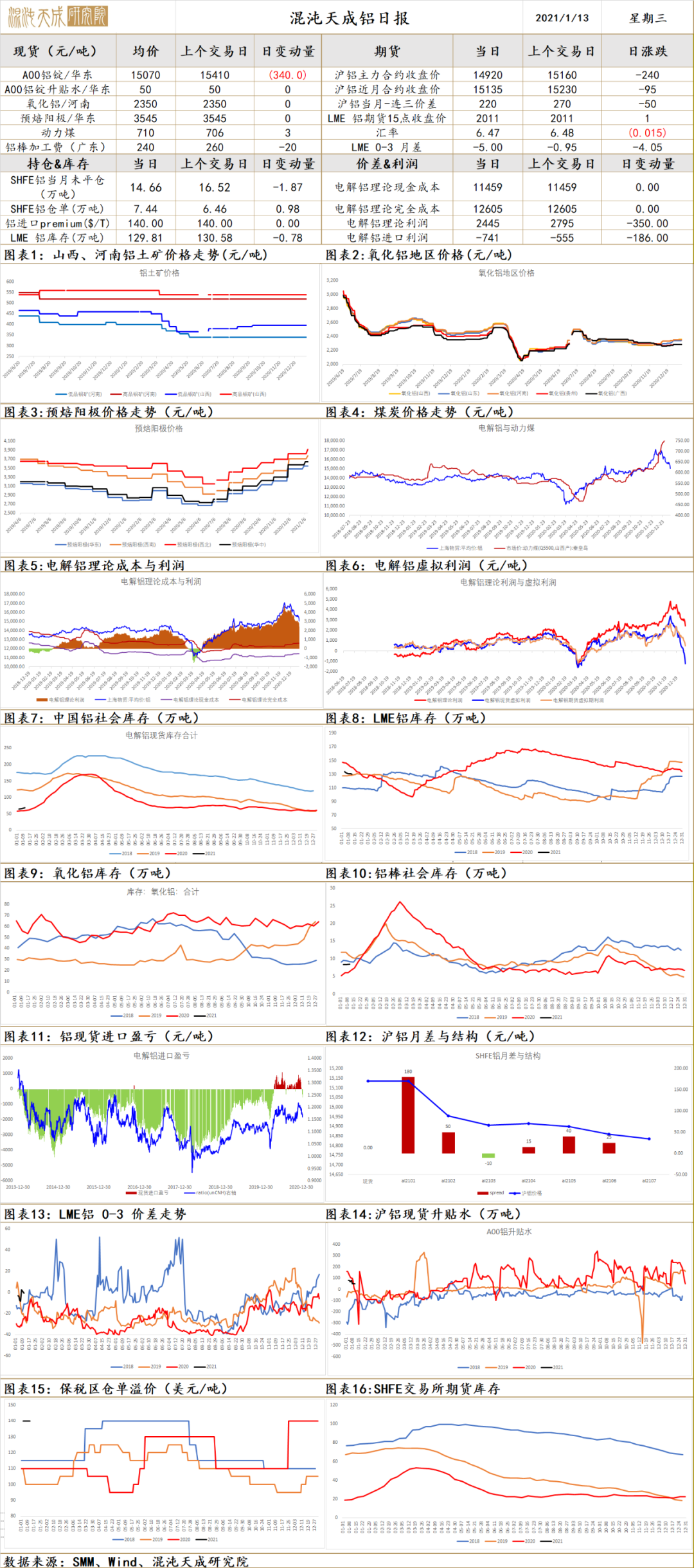 提产加进口增多之下,元旦之后,铝锭持续累库,周一铝锭增加1.8万吨,临近交割铝锭平水报价,由于牛年春节较晚,当前库存已较以往季节性明显增加,阶段压力显现,铝价弱势运行。整体来看,电力紧张之下,明年一季度前投产产能有限,铝锭进口窗口关闭后,2-3月份进口有望回落,进口压力降低,春节后需求仍能韧性维持,当前铝价阶段调整持续,中期铝价震荡上行依然可期。