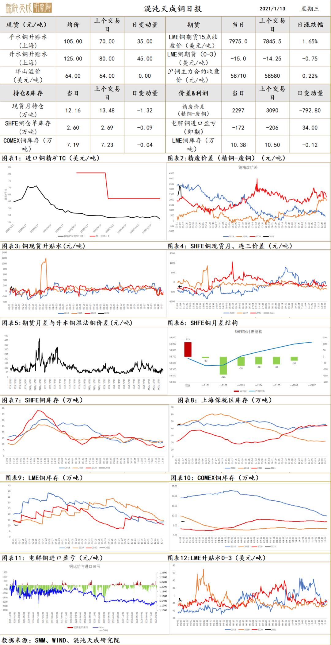 3、(粗铜)江西铜业与中色签署2021年CIF进口粗铜长单加工费:据了解,江西铜业和中色旗下赞比亚粗铜生产商谦比希签署2021年CIF进口粗铜长单Benchmark为145美元/吨。此RC较去年的每吨128美元有明显回升,尤其是在铜精矿长单加工费Benchmark由62美元/吨下降为59.5美元/吨背景下,反映了市场对粗铜供应趋向宽松的预期。(SHMET)
