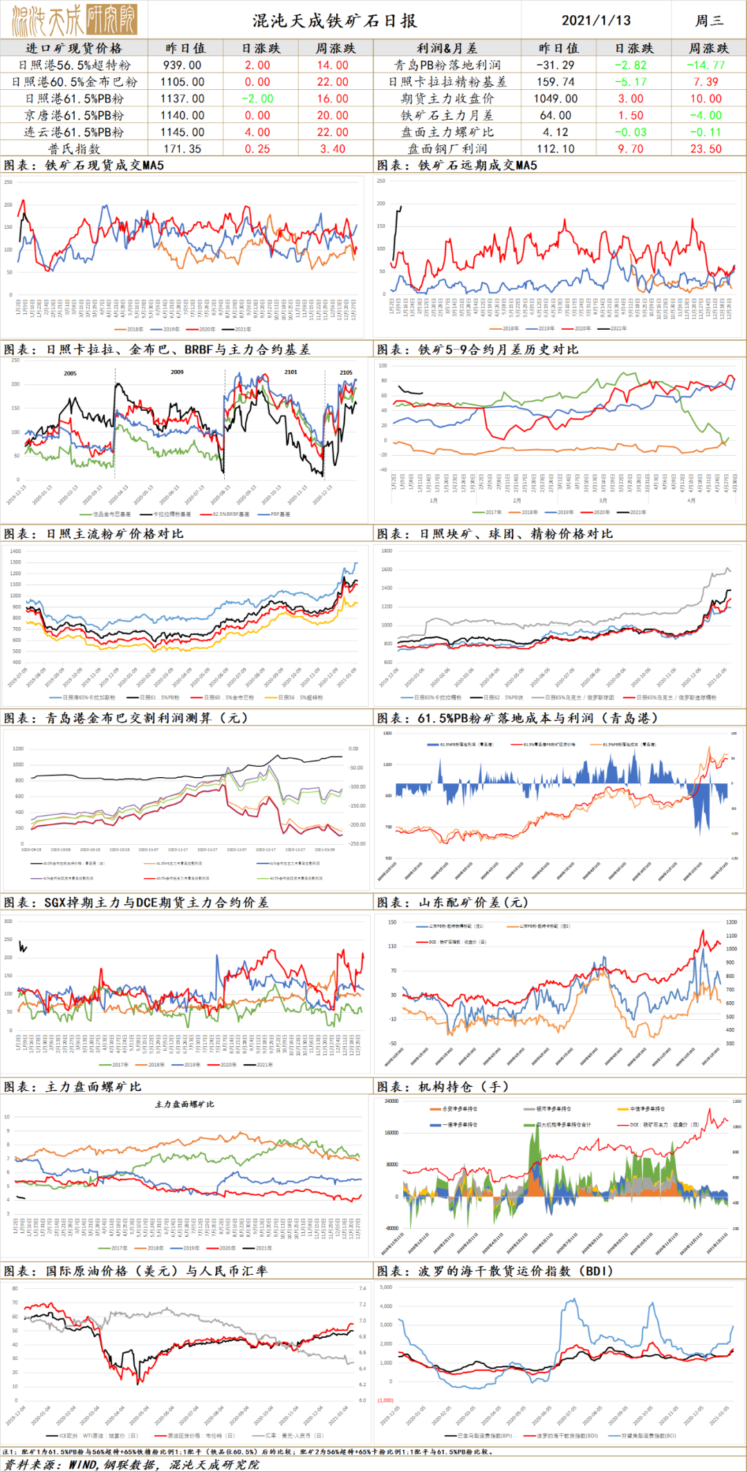 1.Mysteel统计,1月4日-1月10日中国45港到港总量2321.4万吨,环比增加78.3万吨;北方六港到港总量为1155.7万吨,环比增加144.0万吨。中国26港到港总量为2230.9万吨,环比增加98.3万吨。据点钢网统计,2021.1.2-2021.1.8北京六港铁矿石合计到港1088.94万吨,环比增加14.67%,同比增加4.43%。