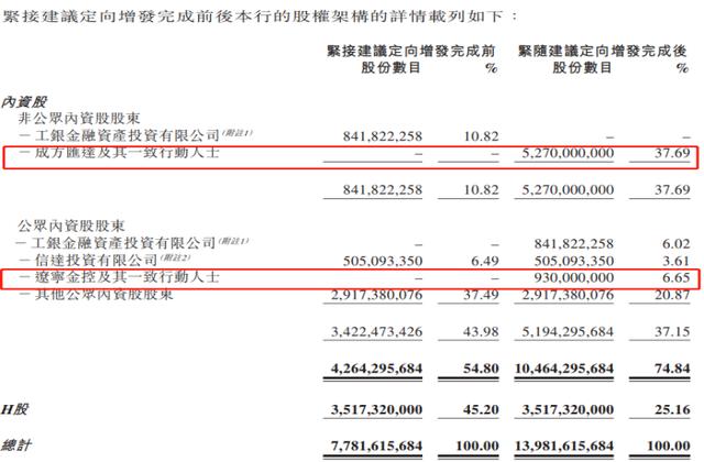 增资完成后该行股权结构也随之发生变化。成方汇达及辽宁金控将占该行经扩大已发行股本总额约37.69%和6.65%,原第一大股东工银金融资产投资有限公司(下称“工银投资”)在该行的股权占比从10.82%摊薄至6.02%,因低于10%而不再作为主要股东。