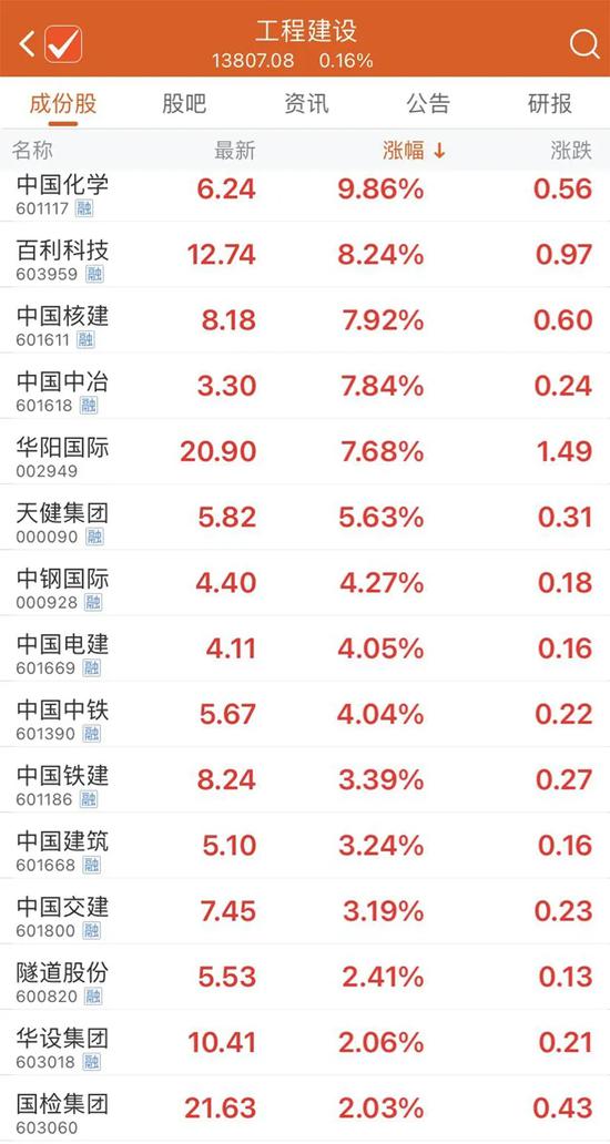 与此同时,早盘活跃资金开始向相对低位的龙头股扩散。中字头基建股涨幅较大:中国中车涨停,中国中冶、中国中铁、中国电建、中国铁建等纷纷跟涨。稀土、工程机械、航运等板块也有所表现。