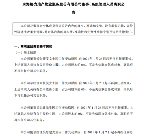 关于张筱雯等三位高管离职的原因,格力物业相关人士则对时代财经称,“没有离职,也没有其他原因,正常的工作变动。其中一位快退休了,张筱雯有其他工作安排,具体工作不方便透露。”至于公告为“离职”的原因,该人士则表示是“新三板的格式要求”。