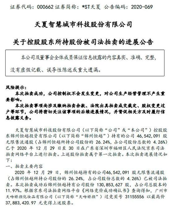 就在2020年12月29日-30日,*ST天夏控股股东锦州恒越投资有限公司所持4654.21万股无限售流通股(占锦州恒越所持公司股份的26.24%,占公司股份总数的4.26%)在广东省深圳市福田区人民法院京东司法拍卖网络平台上进行了拍卖,最终由广州市天吻娇颜化妆品有限公司拍得。