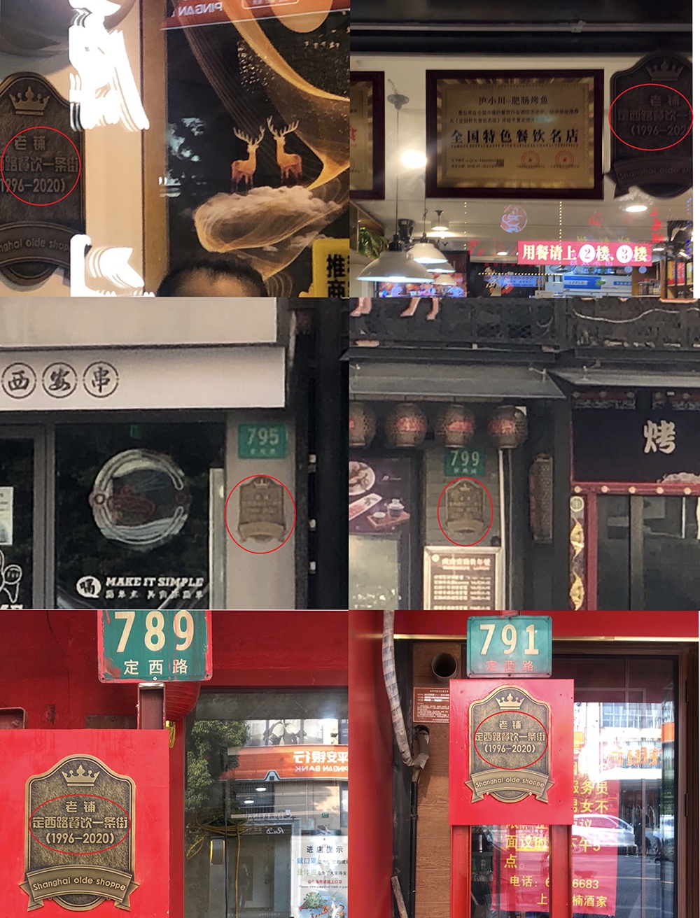 2020年12月7日,记者来到定西路看到,仅有定西路789号到809号烤鱼店、海鲜店、日式烧肉店、烧烤店和两家火锅店,共计6家店铺悬挂了该样式一致的“老铺”铭牌,其中5家挂于门外,1家挂于门内。记者联系到了几家店铺的老板了解到,定西路795号“简单点食堂”营业了一年多,809号“沪小川肥肠烤鱼店”开了半年。而789号“红村羊蝎子火锅”经营了十年以上,另外一家805号“九龙城蒸汽海鲜店”,主店在马路对面,也开了十余年。