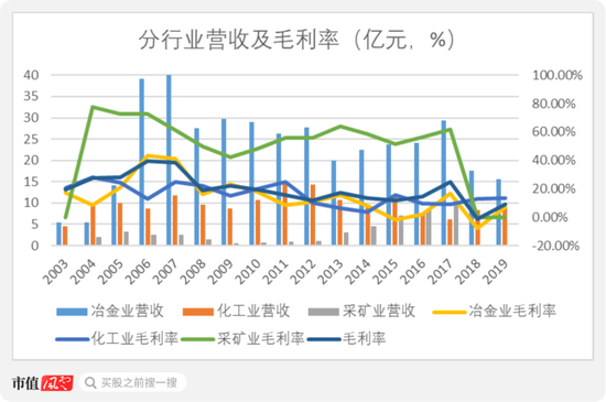 从行业划分,宏达股份营收主要由化工业和冶金业构成,其中2004-2018年增加了采矿业。但是随着金鼎锌业的股权无效,采矿业终止,给冶金业务带来了重创。