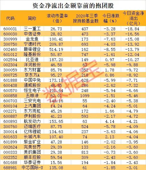 赣锋锂业今日大跌超8%,公司股价2021年以来涨幅达24%,2020年三季报显示有161家基金持股,公司市值于去年底突破千亿。宁德时代今日也是下挫4%,中国中免、迈瑞医疗等跌幅均超5%,被市场称为“油茅”的金龙鱼跌幅超7%。
