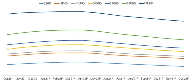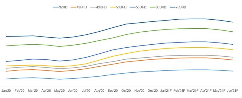 另一家专业研究机构群智咨询也预计,LCD TV面板价格在2021年一季度依然维持上涨的趋势,预计二季度价格趋于平稳。