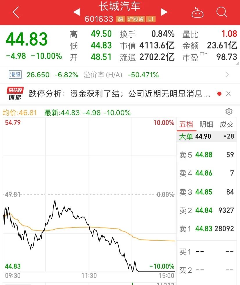 今日午后,最近一年股价狂飙的长城汽车,突然跌停,到收盘仍然封死跌停,收跌10.00%,报44.83元,成交额23.6亿元。长城汽车A股跌停,H股也大跌6.64%。