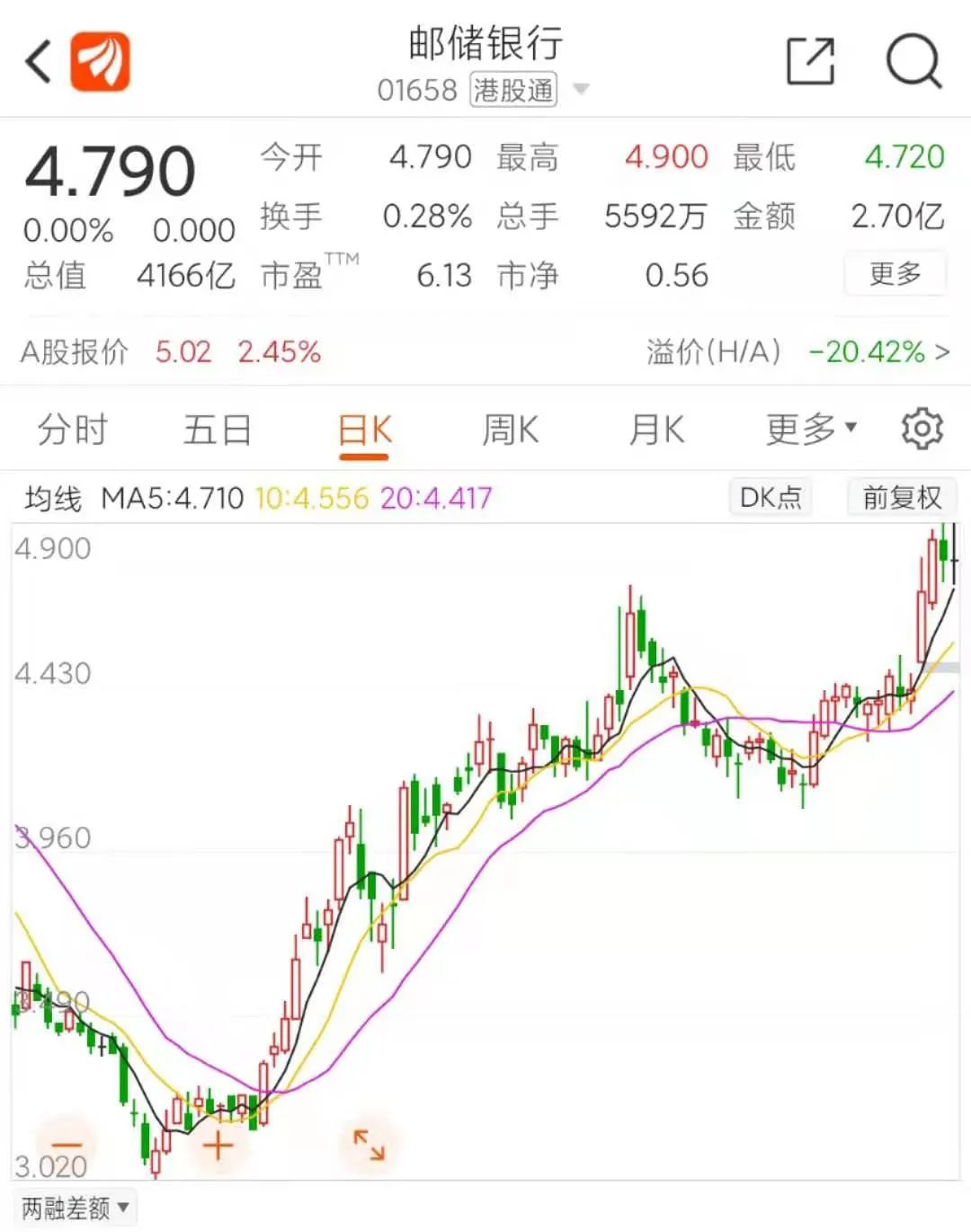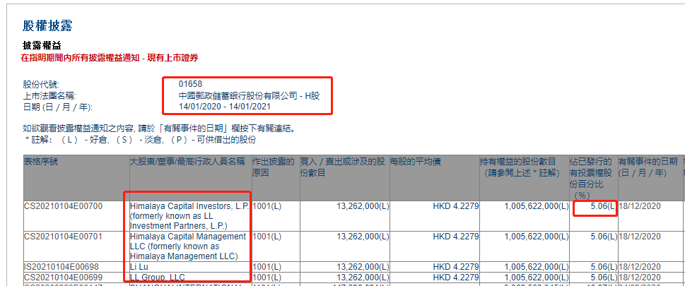 1月4日,港交所披露易显示,2020年12月18日,被称为“巴菲特接班人”的李录通过旗下的喜马拉雅资本,以平均每股4.228港元/股的价格,完成对邮储银行H股1326.2万股增持。据此计算,喜马拉雅资本此次增持总耗资约5607万港元。