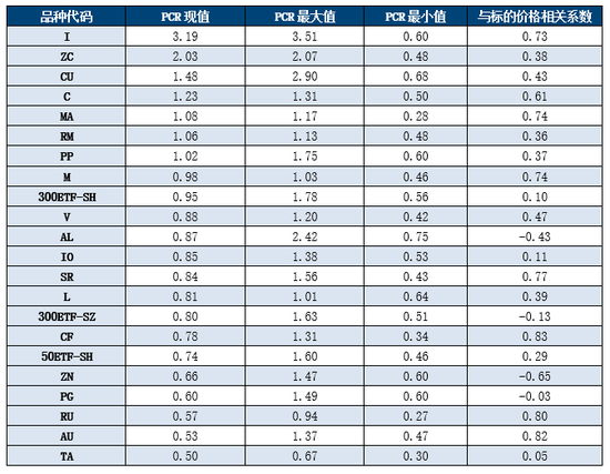 表2:2020年各品种持仓PCR数据(按PCR大小排名)