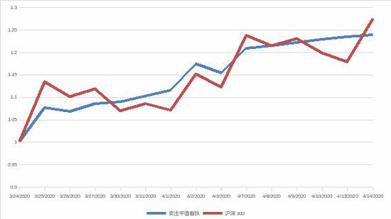 3月24日,300指数在二次探底后反弹,收盘价为3625.11点,我们选择在这一天进场,卖出一手执行价为3600的4月看跌期权,权利金14440元,期权隐波为43%。4月14日,300指数当天收盘重回3800点,期权隐波也已降至28%,时间价值所剩无几,我们平仓出场,赚得权利金之差14440-140=14300元。假定期权保证金为60000元,策略持仓期21天,收益率23.83%,最大回撤2%。