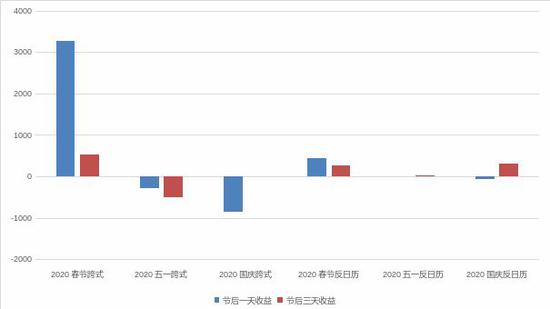 那有没有一种更加稳健的策略做法呢?其实,LongGamma策略里还有一类策略,叫作反日历价差组合。与买入跨式不同的是,反日历价差组合在做多Gamma的同时,波动率上是一个空头头寸。具体做法是在原有买入跨式组合基础上,再卖出一组远月同行权价的跨式组合。使用该策略时,除了希望行情发生剧烈变化外,还能从期权隐含波动率的下降中获益。这种收益模式使该策略往往有一个更加稳定的收益曲线,在长假时使用也有更高的胜率,但是绝对收益会小很多。从图20可以看出,反日历价差组合在今年长假中都能取得正收益,但收益整体水平不高。