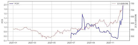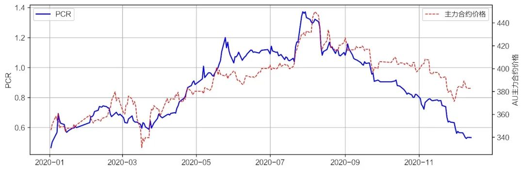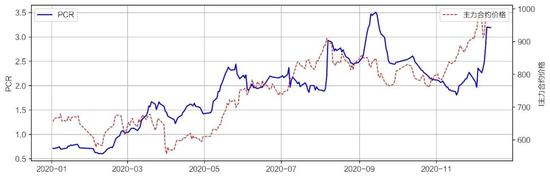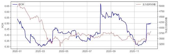 从下图表中可以看到,大部分品种PCR值跟其标的价格走势有较大相关性。当前市场中PCR值最大的两个品种,铁矿和动力煤,在最近两个月中都走出了一波强势的上涨行情,其中铁矿PCR值更是随着期货价格全年上涨而一路升高,表现出了较强的相关性。而在当前市场PCR值最小的两个品种中,黄金PCR值几乎走出了和期货价格完全一致的走势,近半年大幅走低;另一个品种PTA的低PCR值看似与近期的上涨行情出现矛盾,但如果考虑到当前值在今年以来PCR区间内的较高水平,及其从11月初开始逐步回升的表现,也能较好的反映出期货价格的走势。