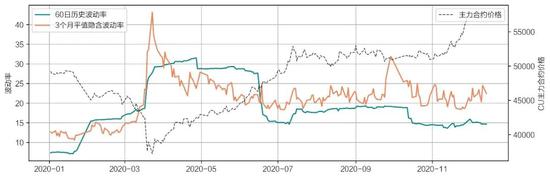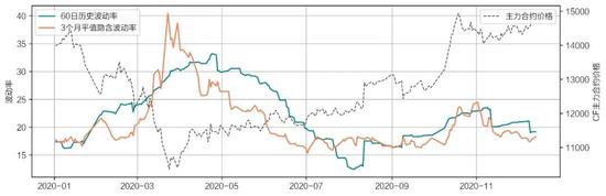 2020年期权市场最大的一个特点,就是大部分品种的波动率走势出现了惊人的一致。从图11-17中可以看出,由于受到“黑天鹅”新冠疫情的影响,除部分农产品外,所有商品及金融类期权的波动率在上半年的走势相关性较高,分别在春节前后和3-4月份经历了两波上升,其中在第二段上升期很多品种无论是历史波动率还是隐含波动率水平都创下了新高,且隐含波动率与历史波动率差值拉大。之后的4-6月份,随着全世界各国的几轮“放水”救市,全球经济开始复苏,资产价格逐渐修复,期权隐含波动率率先下行,历史波动率随后跟随。进入下半年,随着疫情影响的减退,各品种估值开始回归基本面,其波动率走势也开始出现分化。金融类及金属类品种受益于市场流动性充裕的环境,在7月份迎来了价格与波动率的“双涨”,其中金融类期权的隐含波动率一度达到3-4月份的极值水平。另一个影响较大的节点在国庆节前,由于市场担忧长假期间可能出现的风险,许多品种的隐含波动率在节前走高,但在节后因为风险没有兑现而迅速回落,只有橡胶、棉花等品种走出了一轮趋势行情,波动率快速上升。进入12月以来,多个品种从原先的震荡区间走出了新一轮上涨行情,波动率也水涨船高,比较典型的品种有铁矿、动力煤等。