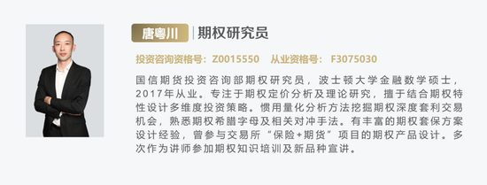 分品种来看,50ETF期权和300ETF/股指期权的波动率水平较为接近,这也和两者本身权重股有较大重叠有关。当前市场波动水平整体较低,短期可考虑在隐波更高的50ETF上做备兑看涨组合。不过,当出现像今年2-3月新冠“黑天鹅”的事件时,300指数的波动幅度明显更胜50指数一筹。因此,当需要用期权进行风险事件投资或对冲资产风险时,300ETF/指数期权会是更好的选择。