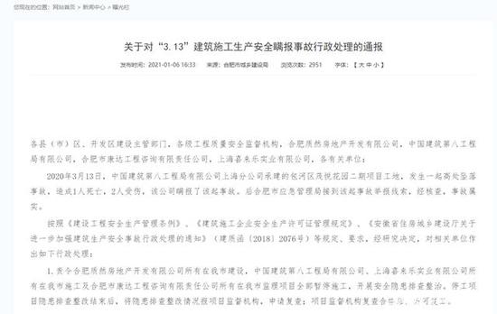 2021年1月6日,合肥市城乡建设局发布关于《对“3.13”建筑施工生产安全瞒报事故行政处理的通报》。