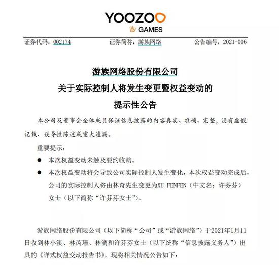 在信披义务人关系上,游族网络披露显示,林小溪、林芮璟为林奇女儿,林漓为林奇儿子,许芬芬为三人的母亲,目前为其法定监护人、法定代理人。由于三名子女均系未成年,三人所持有的公司股份之股东权益统一由许芬芬行使。游族网络表示,本次权益变动完成后,公司无控股股东,许芬芬为公司的实际控制人。