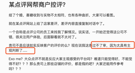 在拒绝了商家的“有偿删评论”提议后,这位网友却发现,自己的点评意外消失了。