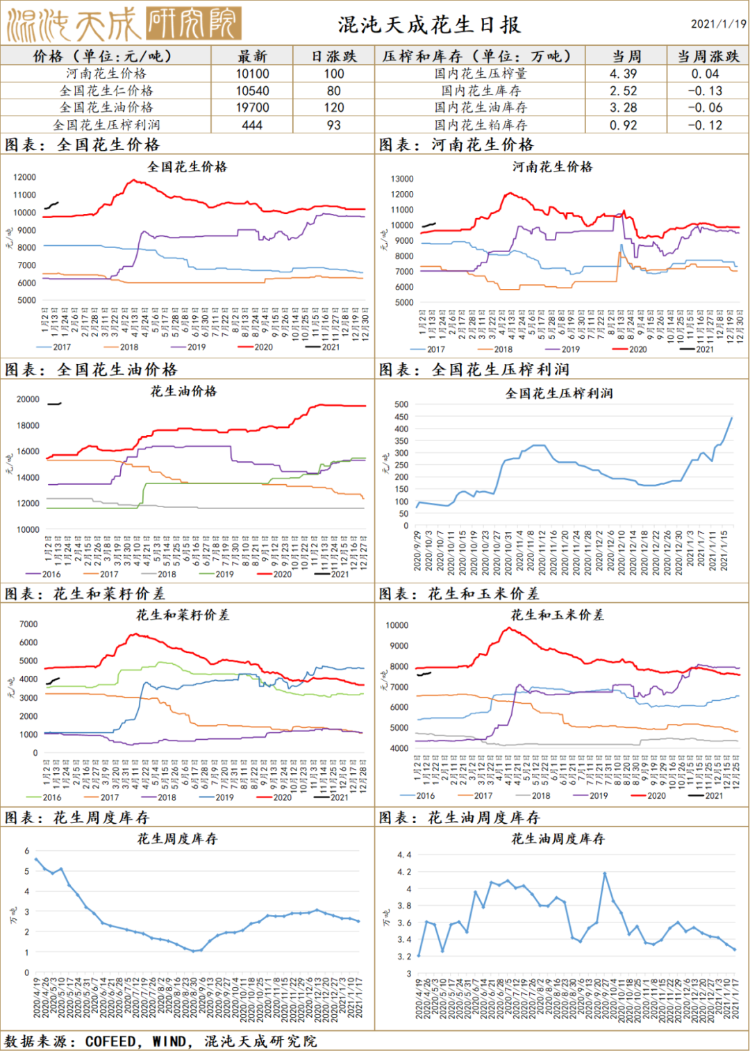 花生压榨利润走高,上周压榨量小幅上升,由于价格高企,下游买货意愿不强,节前备货接近尾声,替代物大豆、菜籽等价格上涨,支撑花生价格。整体油价走高也带动花生油上涨,预计近期花生系稳中偏强运行。