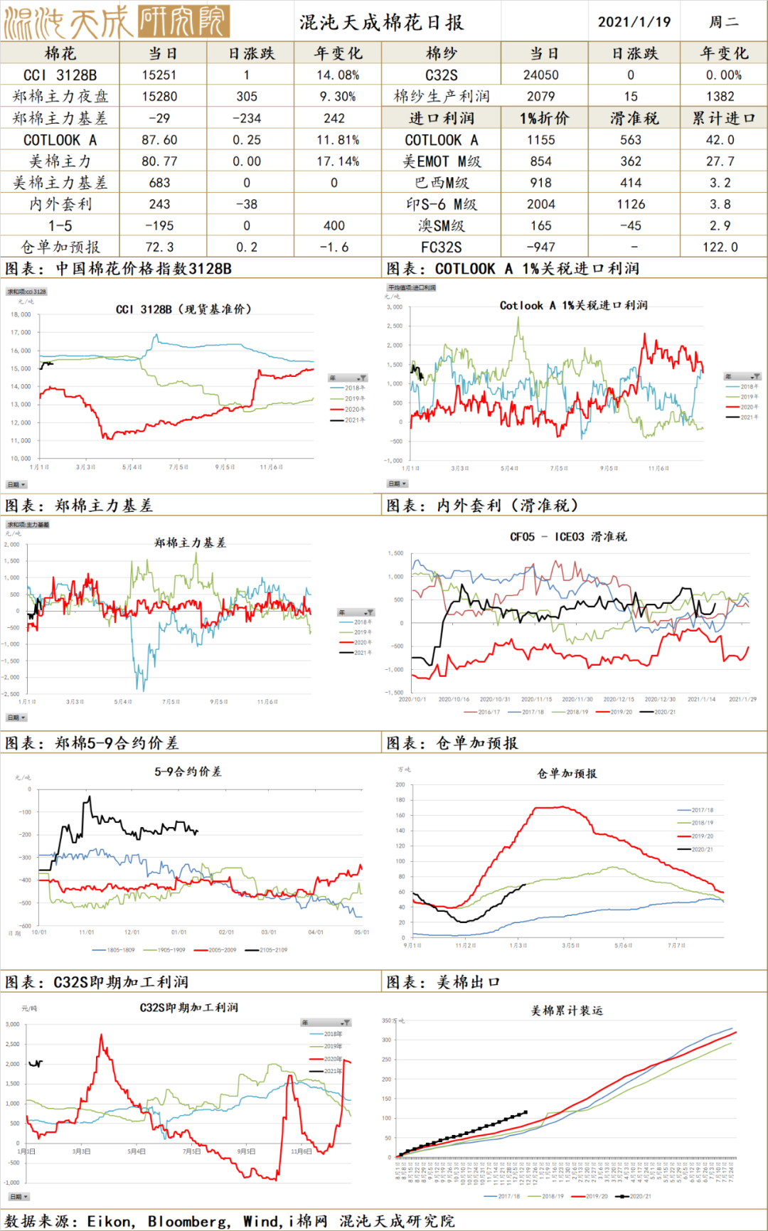 美棉出口:截止2021年1月7日当周,签约新增8.21万吨,增至4周均值水平,其中中国采购3.59万吨;出口6.46万吨,发往中国3.67万吨。