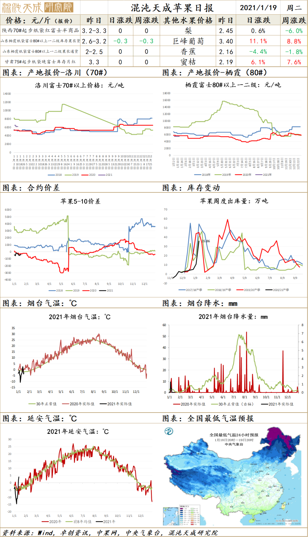 1月18日苹果03合约开盘不久涨停,随后打开涨停板,全天高位震荡,苹果期货大涨,主要和替代水果近期遭遇冻害有关,近期全国的降温,对福建、广东、云南、海南的南方水果造成一定的影响,尤其是云南的香蕉、福建的香蕉及柑橘,据我们向产地了解,初步评估1月中旬的寒潮对柑橘、香蕉造成的减产影响,约占全国水果年产量1%左右,整体影响不大,主要是苹果持续下跌至6000元/吨附近,消息层面的利好被放大,近期主要是关注春节备货进度,以及国内疫情的发展情况,从苹果本身的供需来看,仍旧偏弱,当季合约反弹空为主。