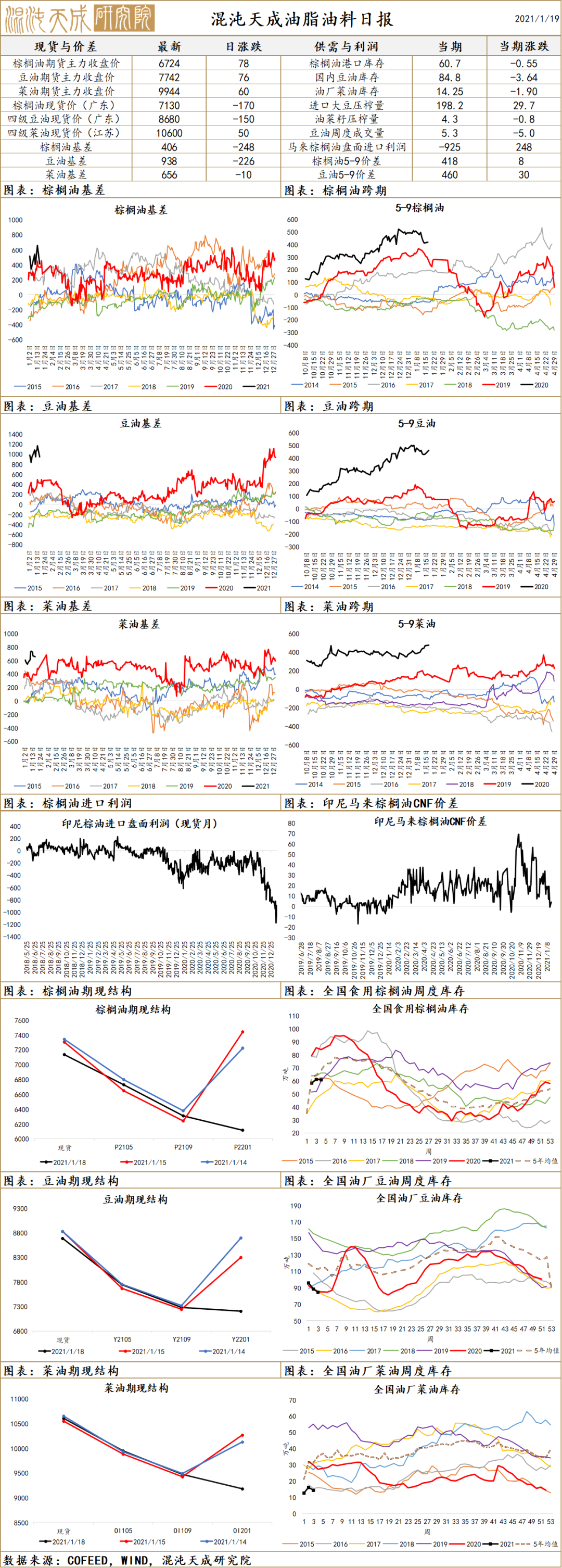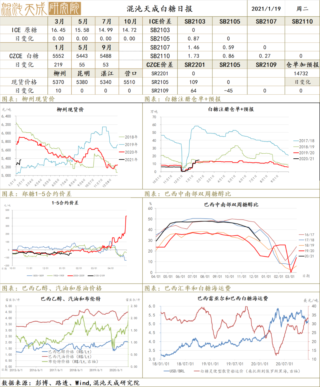 1.巴西榨季提早进入尾声,供应边际减弱,2020年12月下半月中南部产糖1.1万吨,本榨季产糖累计3820万吨。东南部天气条件恶化;新榨季随着油价回升及甘蔗生长调减偏差,食糖产量或大幅减少,当前疫苗进展好;