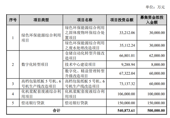 为了解决债务问题,博汇纸业发布业绩预告的同时推出了定增募资计划。公告显示,博汇纸业拟定增募资50亿元用于绿色环保能源综合利用项目、数字化转型项目、高档包装纸板5号机、6号机生产线改造项目、化机浆配套废液综合利用项目以及15亿元偿还银行贷款。