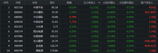中国平安、中兴通讯、中芯国际分别遭主力资金卖出11.17亿元、3.32亿元、3.00亿元。