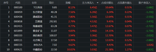 从个股来看,主力资金最青睐的3只股票分别是TCL科技、东方财富、通威股份,流入金额分别为6.45亿元、6.20亿元、5.56亿元,所对应的涨幅分别为8.12%、7.56%、7.80%。