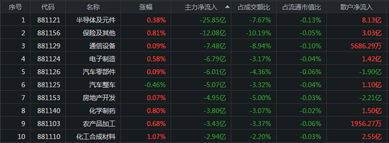 主力资金流出的板块分别是半导体、保险、通信,主力资金流出金额分别为25.85亿元、12.08亿元、7.48亿元,其中散户净流入金额为8.13亿元、3.03亿元、5686.29万元。