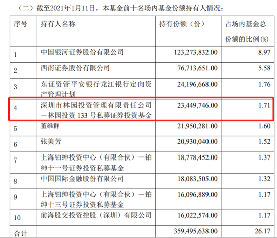1月18日上市交易的鹏华中证银行指数LOF招募说明书显示,深圳市林园投资管理公司出现在前十大场内持有人名单中,为基金第四大场内基金份额持有人,具体持有2345万份,占场内基金总额的1.7%。