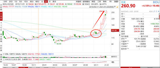 同样案例,发生在百度上。从11月中旬底凯瑟琳已经连续12次加仓百度,此前百度的股价徘徊在100美元左右,甚至一度跌到82美元,处于低估状态。正是在11月中旬以来,随着凯瑟琳的增持,百度的股价已经翻倍,市值再度来到890亿美元。