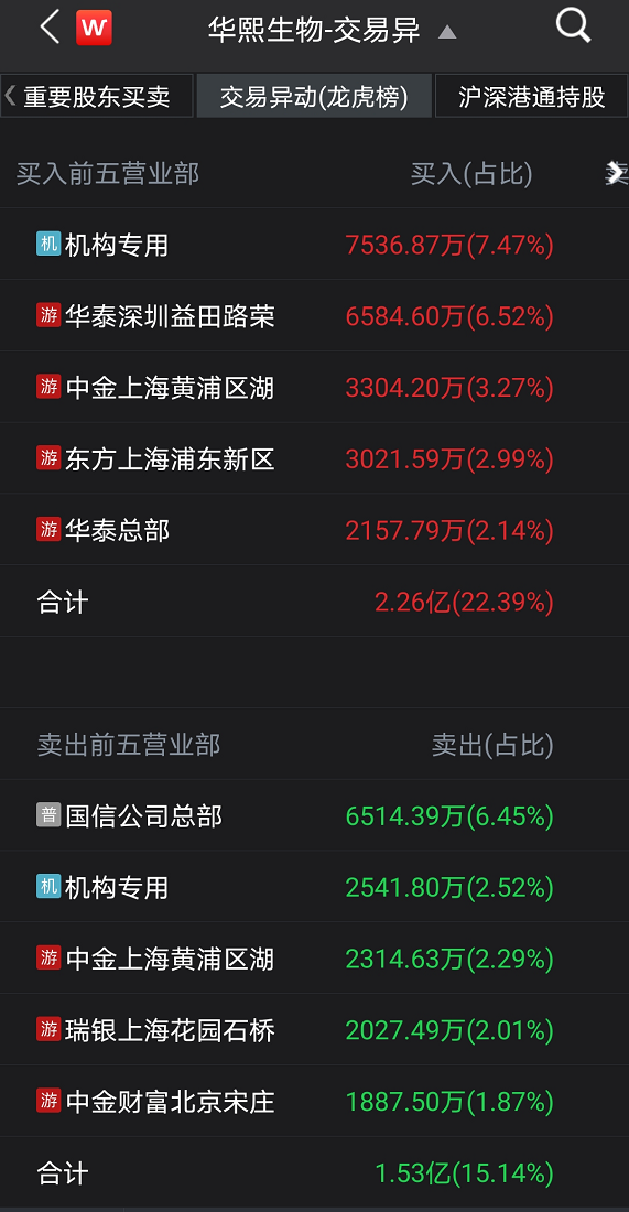 由于涨幅超过15%,华熙生物1月22日登上龙虎榜。数据显示,多家实力营业部及机构席位现身龙虎榜,包括华泰证券深圳益田路荣超商务中心证券营业部、中金上海黄浦区湖滨路证券营业部等。