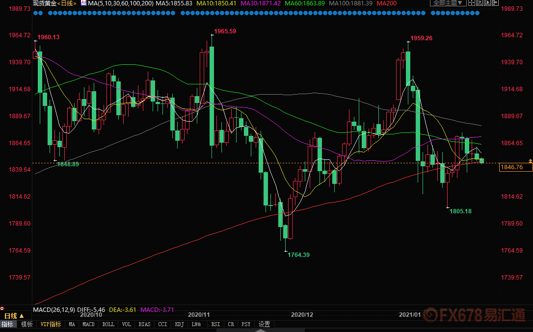 1月16日,国际货币基金组织预计,2021年全球经济将增长5.5%,比10月份的预测高出0.3个百分点,为2007年以来最快增速。预计到2022年,全球GDP将增长4.2%。国际货币基金组织将2021年美国GDP增长预期上调至5.1%。IMF的乐观预计给市场带来信心,冒险意愿增强,黄金跌破1850美元大关,周二(1月27日)亚市盘初,金价一度创三个交易日新低至1845.27美元/盎司。