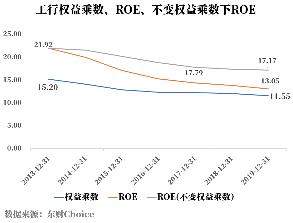 过去几年,杠杆倍数降低一定程度上拖累了工行ROE,假设该行维持2012年底1.5倍的权益乘数,当前ROE应为17.17、拖累了3个百分点。