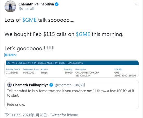 美东时间周二盘中, 前脸书高管、风投公司Social Capital的CEO 查马•帕里哈皮蒂亚(Chamath Palihapitiya)在推特上表示,他购买了游戏驿站看涨期权,押注该股将走高,引发该股票一波上涨狂潮,并使得该股周二收盘上涨92.7%。