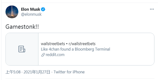 盘后,马斯克也发表推特,为游戏驿站的飙升再添了一把火。他在推特上高呼“Gamestonk!!”(Stonk有“猛烈炮击”之意),并且发布了一个链接,链接指向了美国社交论坛Reddit上wallstreetbets板块,而这一板块正是炒作游戏驿站的散户股民的主要聚集地。