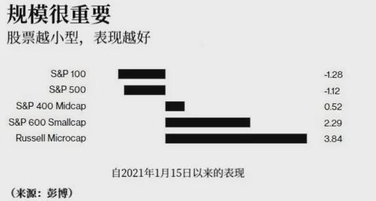 同时,据彭博的统计数据显示,自2021年1月15日以来,低价股的交易量也迅速激增,股票市值越小,涨势越明显。