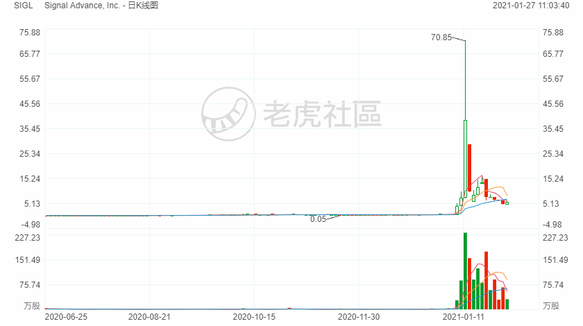 1月7日,马斯克在推特上向网友推荐了一款名为Signal的加密通讯服务。然而令人意想不到的是,同日在美国场外市场交易的医疗设备公司Signal Advance应声暴涨,从6日收盘60美分涨至3.76美元。在媒体报道这个差错后,该股继续翻倍至7.19美元。根据公开市场资料,Signal Advance自2019年起就未向SEC提交过年报,该公司在2014至2016年期间没有任何营收。