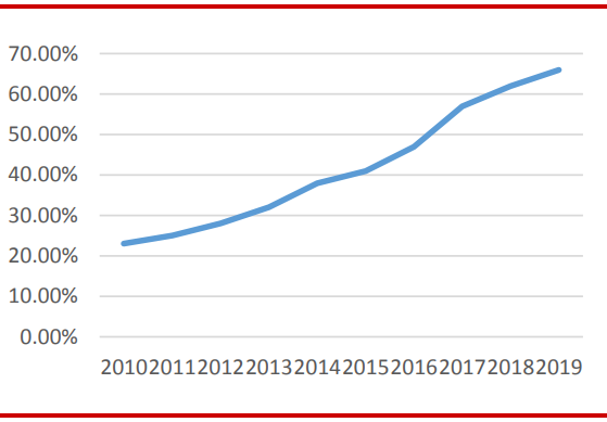 根据USGS的数据,电池行业已成为锂最大的消费领域。锂资源的下游消费应用中电池的占比从不到30%增长到60%,预测随着5G设备的需求增长和电动化趋势持续向好,这一比重将不断提升。